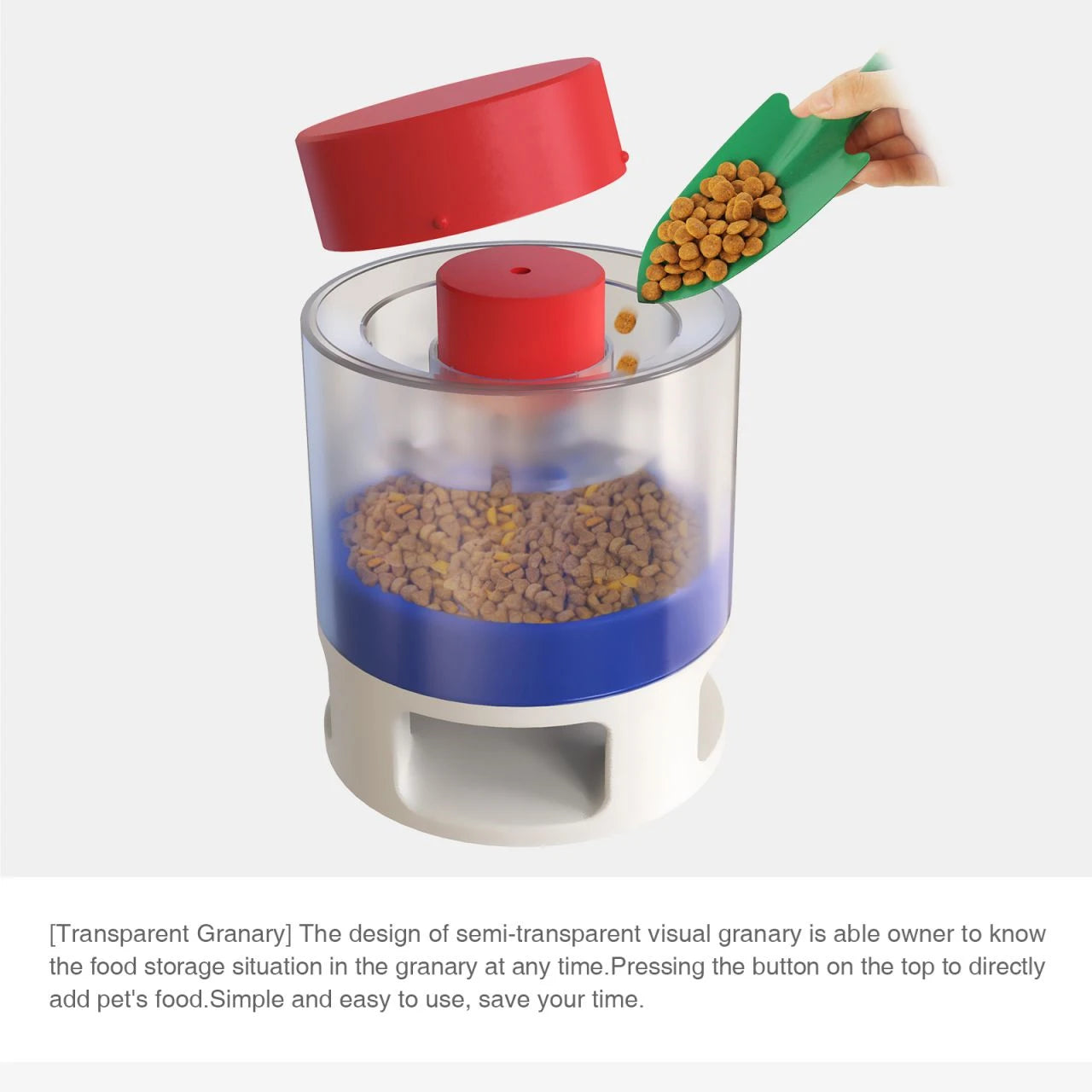 By tapping the top of the feeder, food gets dispensed & randomly drops to 4 direction via the leakage channels at the bottom. This performs as a behavior reward for your pet, attracts the dog's attention, improves dog's intelligence and in the mean time keeps your god moving all the time, reduces risk of obesity & mental decline.
