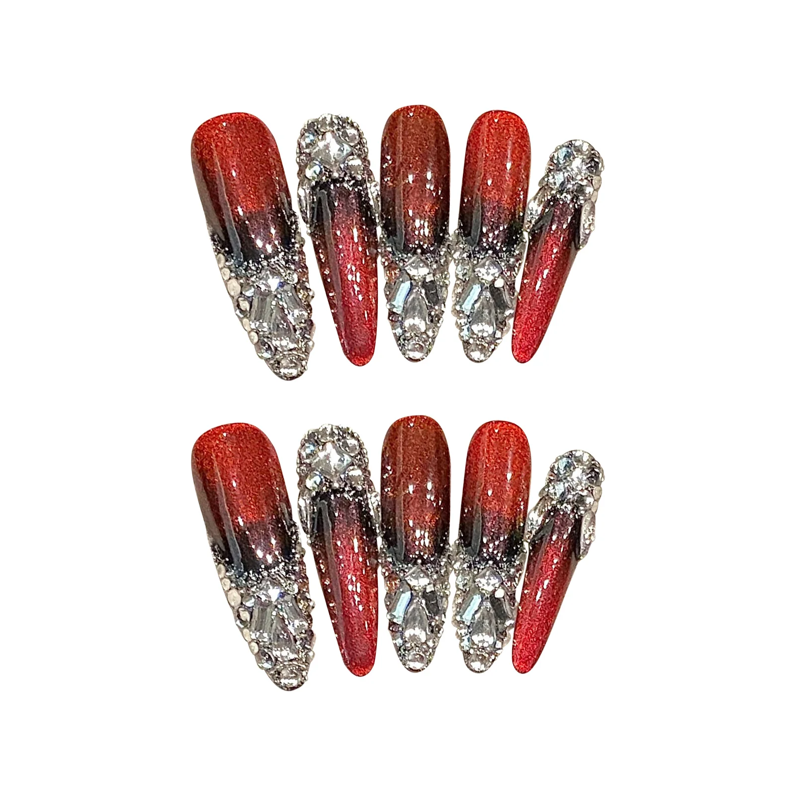 Handmade Long Almond False Nails Red Glitter Designs Wearable Cat's Eye Full Diamond French Nail Tips Heavy Industry Nail Art