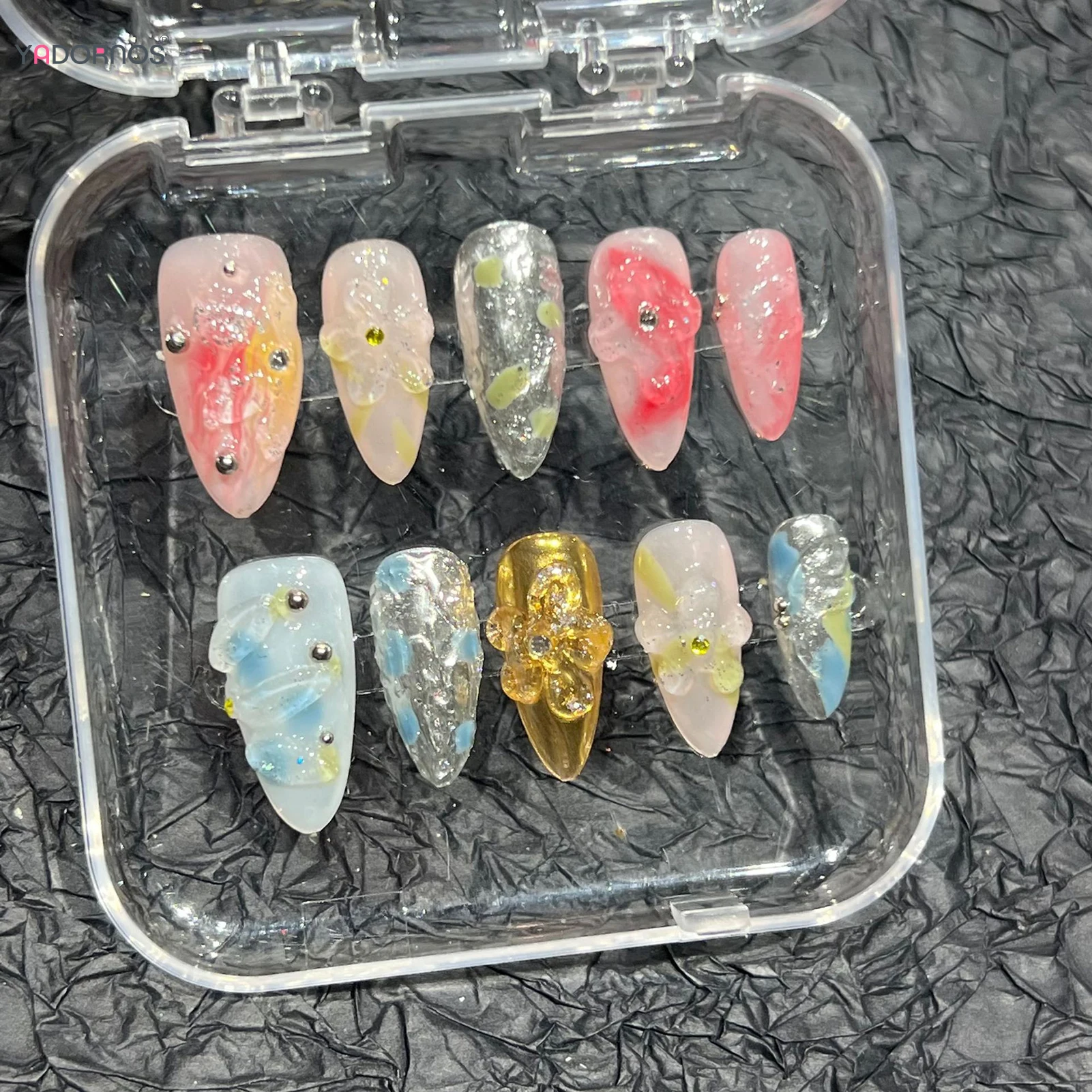 Handcrafted Almonds Press on Nails: These beautifully designed false nails feature a three-dimensional flower pattern that adds a touch of elegance to your manicure. Perfect for stage performances or everyday wear, they are fashion-forward and comfortable to wear, making them ideal for hot girl dress matching.