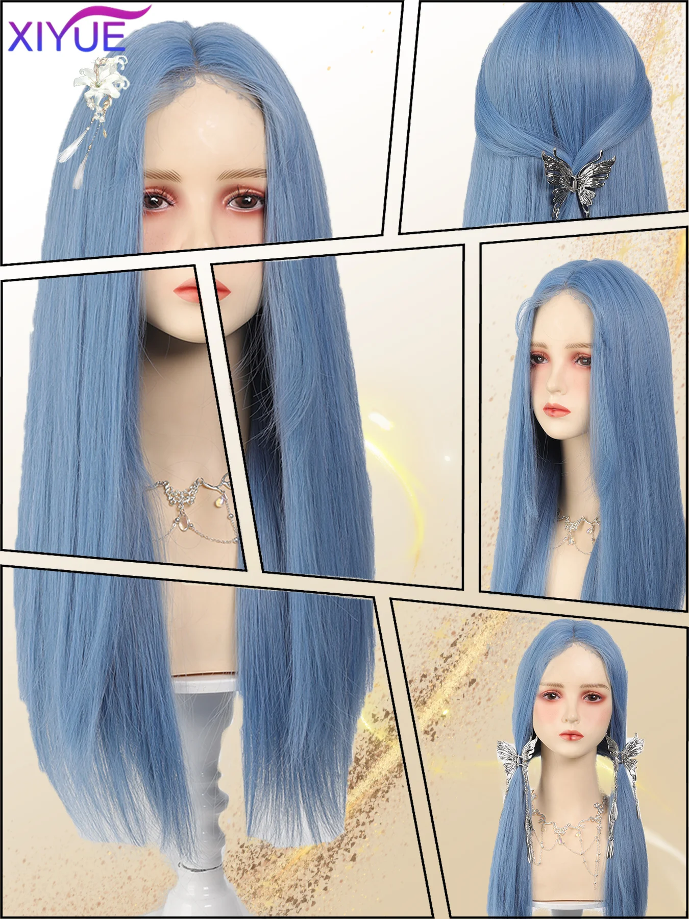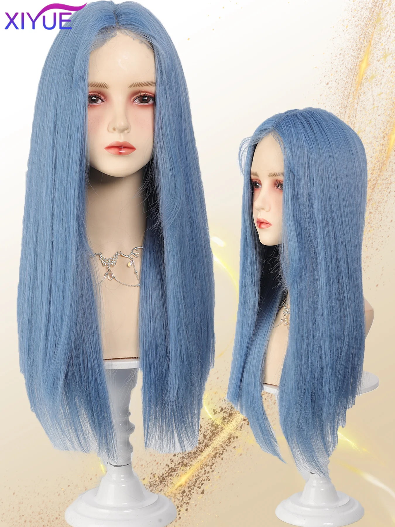 Lace Front Wig Long Straight Synthetic Wigs Light Blue with Ash Highlight Cosplay Wig with Women 、Natural Hair Heat Resistant