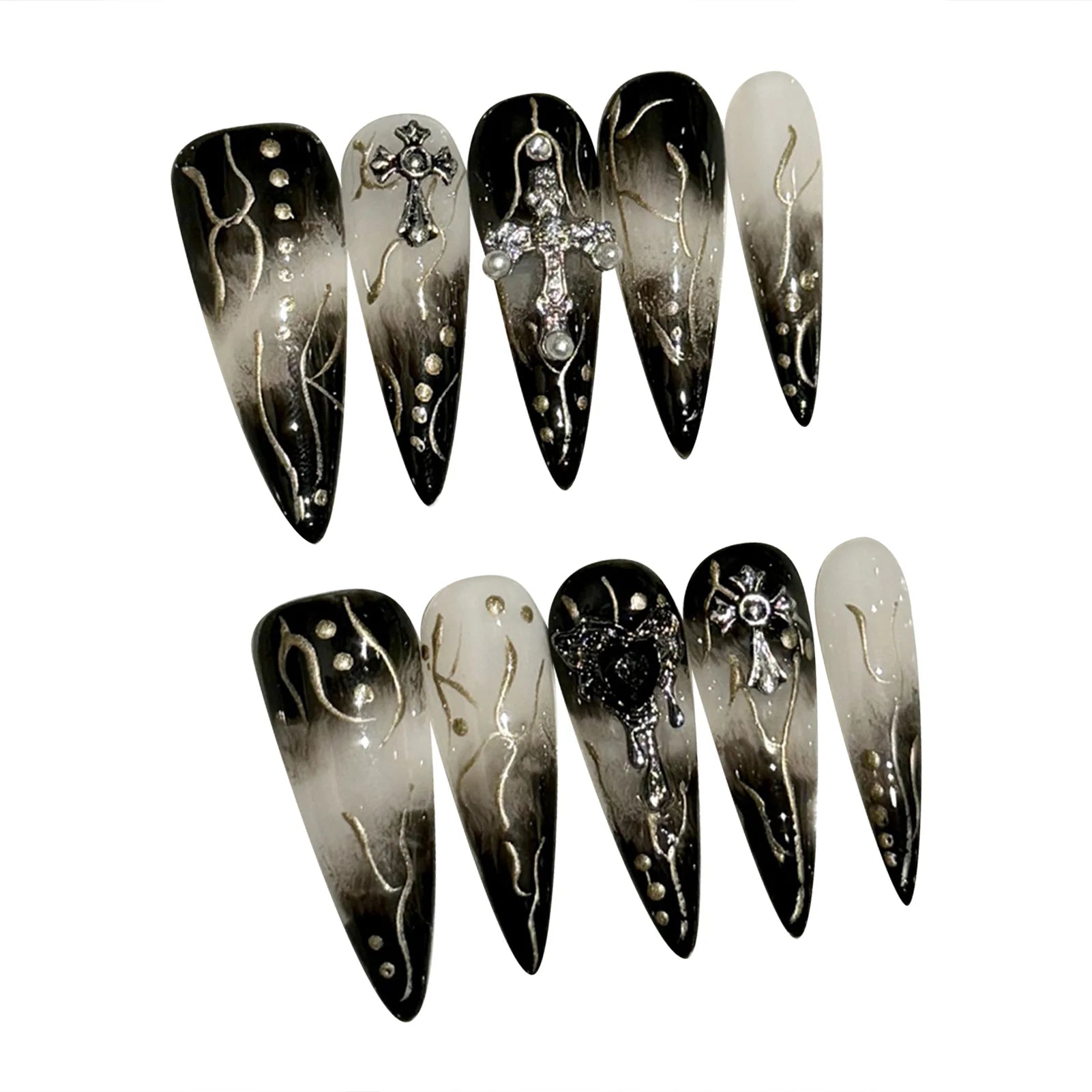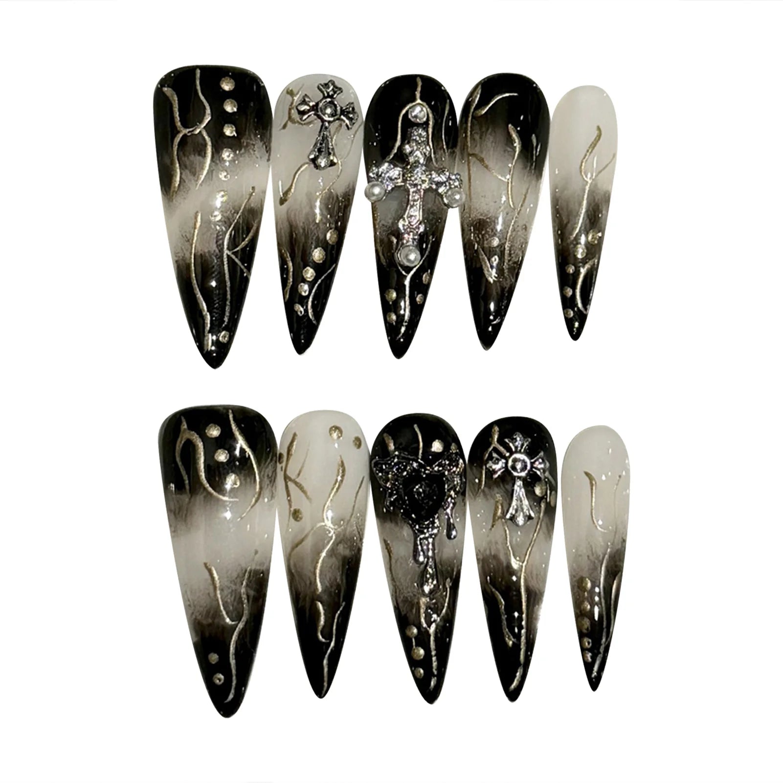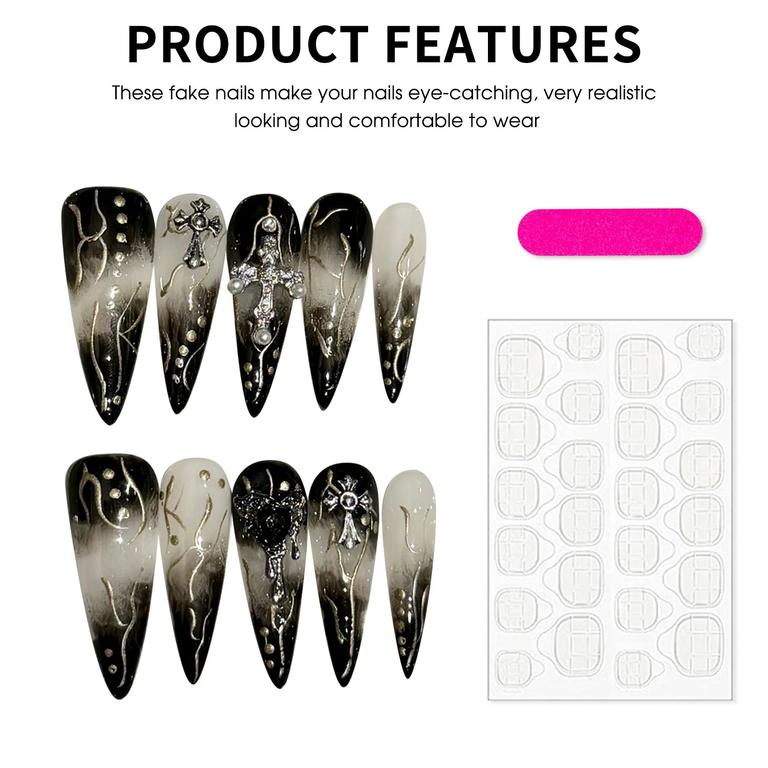 Long Almonds French False Nails Design with Cross Charm Elegant Black Nail Tips for DIY At-Home Manicure