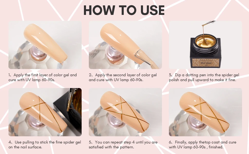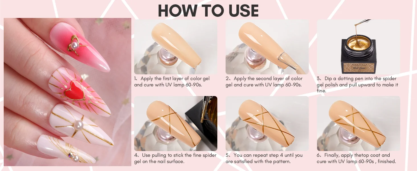 Apply With Chrome Powder--3D gel nail art sculpture spider gel can not only do nail art spider gel nails but also mirror effect spider nails. Apply a layer of Russian matte top coat before drawing the line, and apply with chrome gel paint after drawing the line. You'll get the popular mirror metallic nail gel effect.