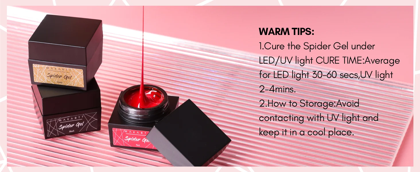 1. Cure the Spider Gel under LED/UV light CURE TIME: Average for LED light 30-60 secs, UV light 2-4mins.