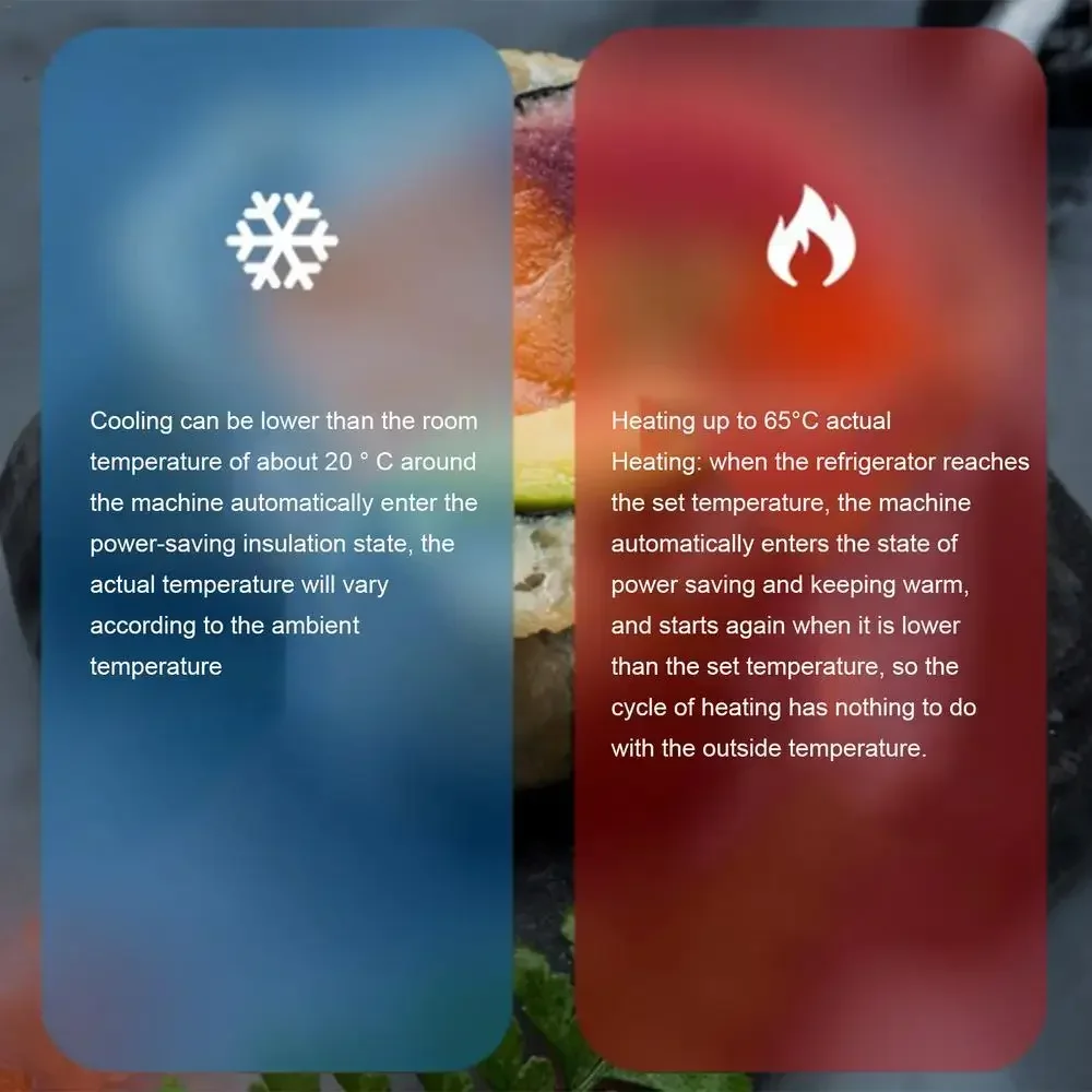 3.Advanced Cooling and Heating: Your ideal travel companion for any season, our dual-use auto refrigerator features an advanced thermoelectric system that can cool drinks or warm meals up to 60-65C. Enjoy icy refreshments at 18-20C below ambient temperature or keep your food toasty warm on your next adventure.