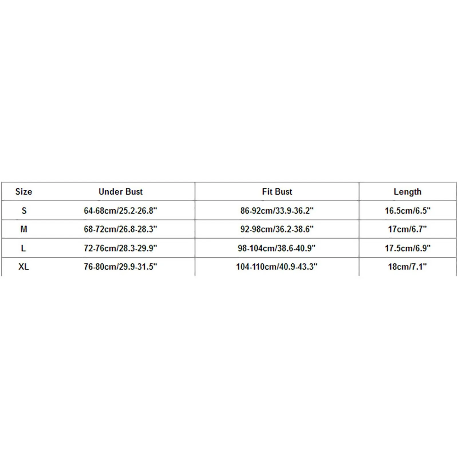 Size:S | Under Bust:64-68cm/25.2-26.8" | Fit Bust:86-92cm/33.9-36.2" | Length:16.5cm/6.5" |