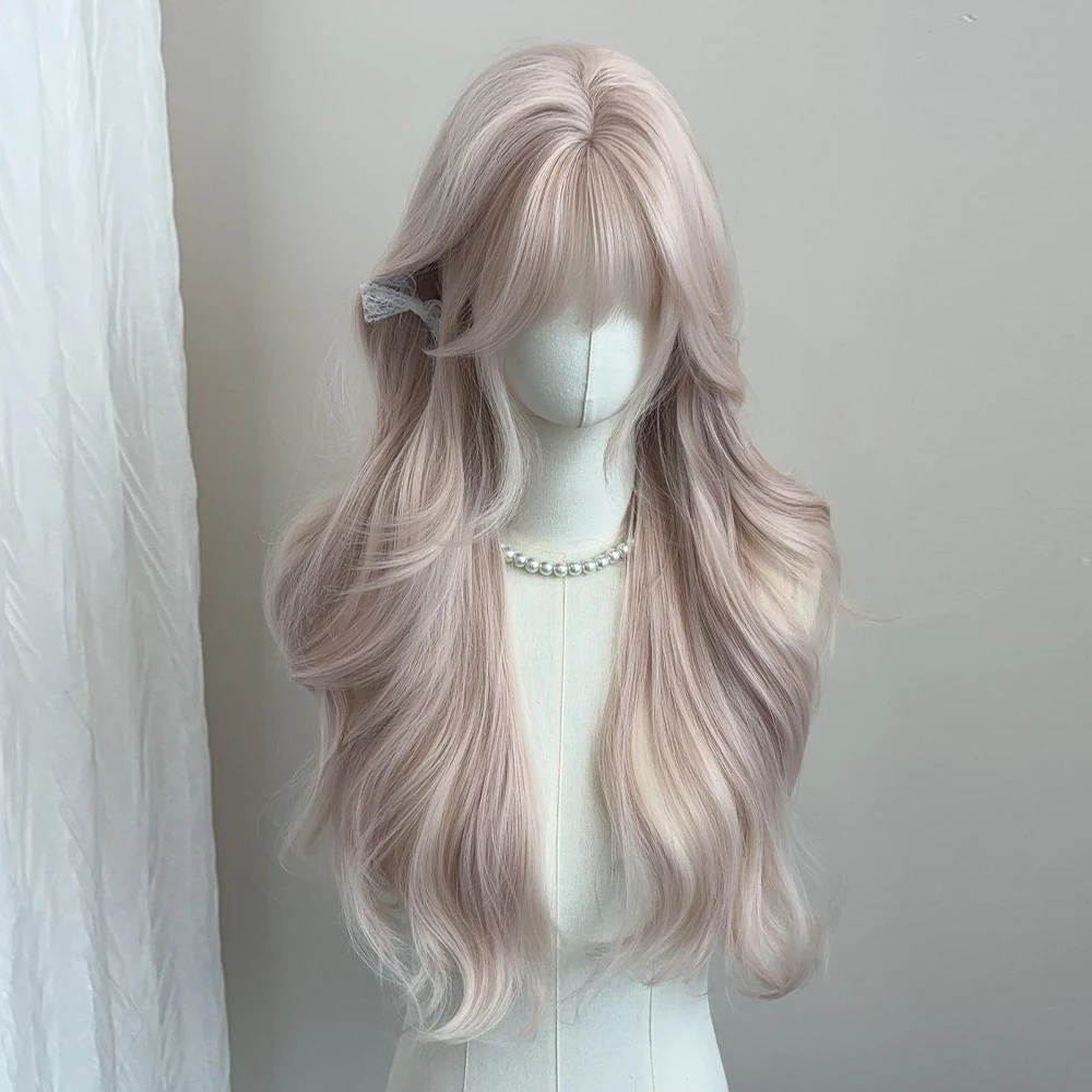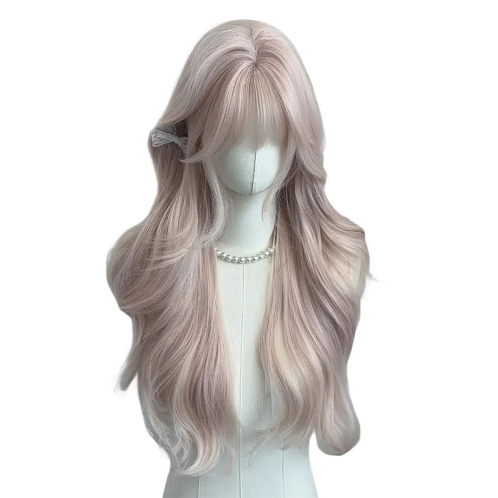 Women's Grey Pink Long Curly Synthetic Wig With Bangs Natural Long-Smooth Heat Resistant Wavy Wig For Cosplay Daily Wear